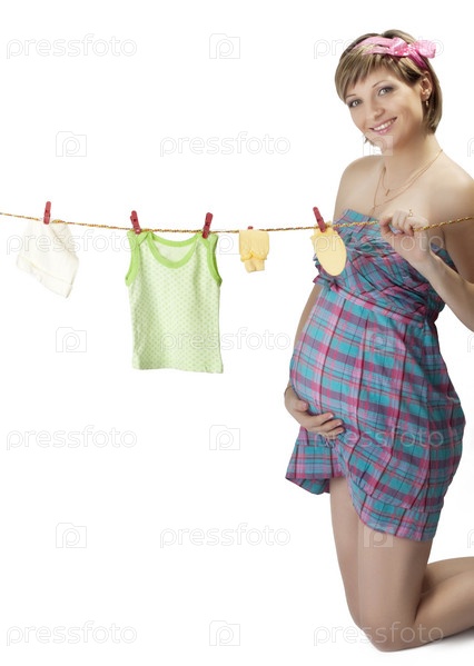 Симпатичная беременная женщина с детской одеждой на белом фоне