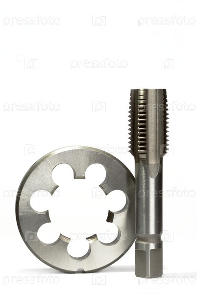 Инструменты для нарезания наружной и внутренней резьбы - плашка и метчик на белом фоне