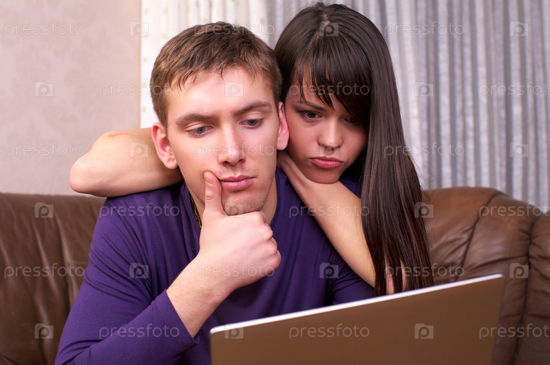 Молодая пара с ноутбуком на диване