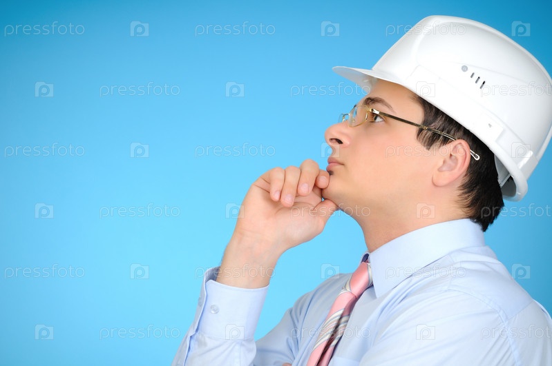 Инженер в каске на голубом фоне