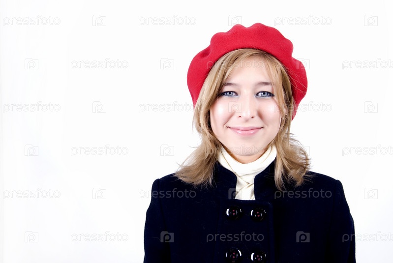 Молодая девушка, одетая во французском стиле, на белом фоне