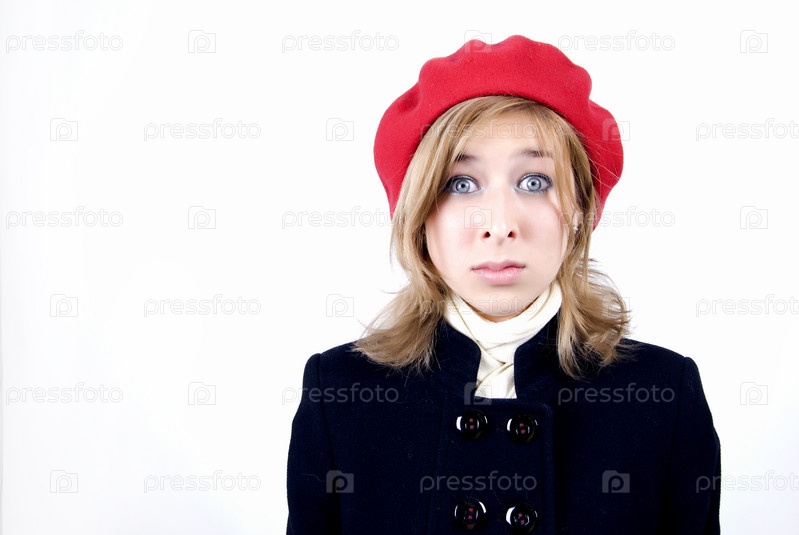 Молодая удивленная девушка, одетая во французском стиле, на белом фоне