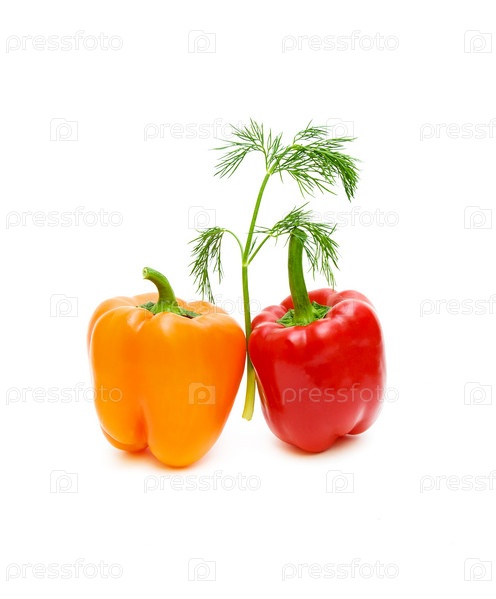 Плоды сладкого перца и ветка фенхеля на белом фоне