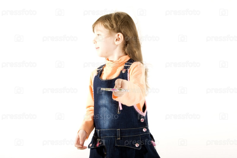 Красивая маленькая девочка с игрушкой, изолированная на белом фоне