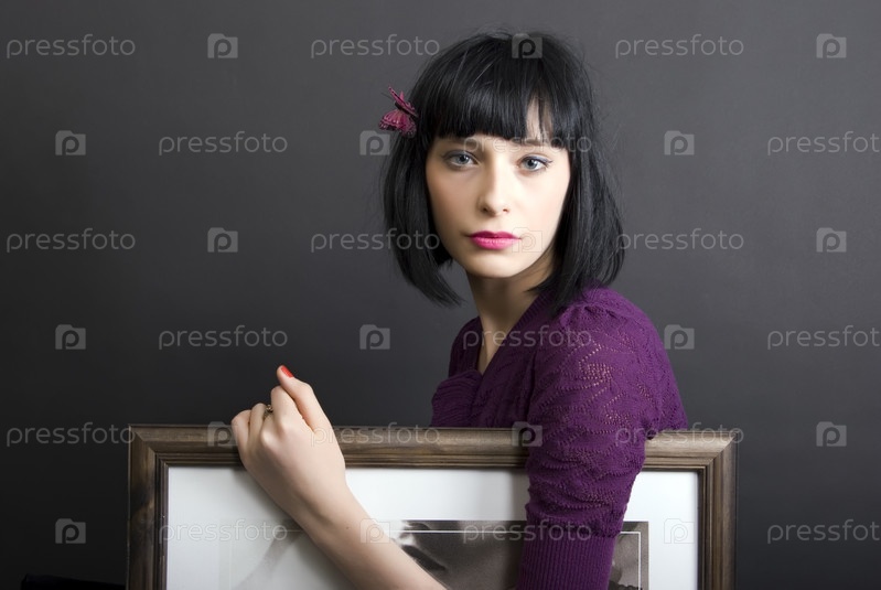 Молодая женщина с картиной в руках на темно-сером фоне