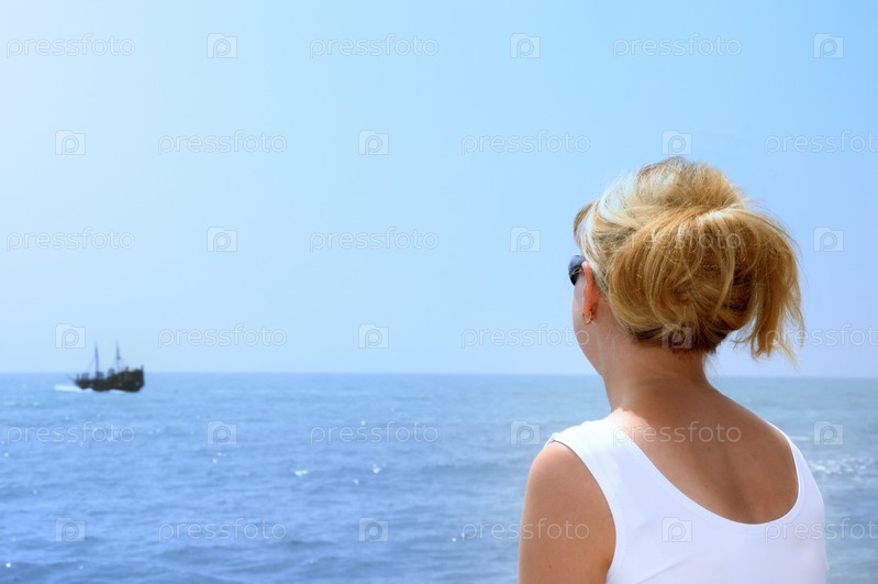 Красивая девушка смотрит на море на пляже под голубым небом