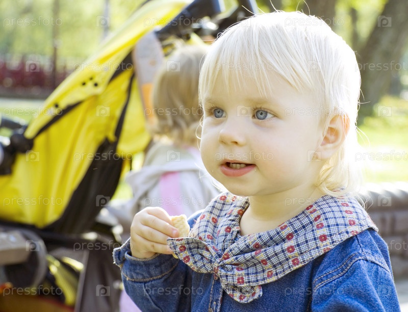 Белокурая голубоглазая девочка с любопытством смотрит и ест печенье