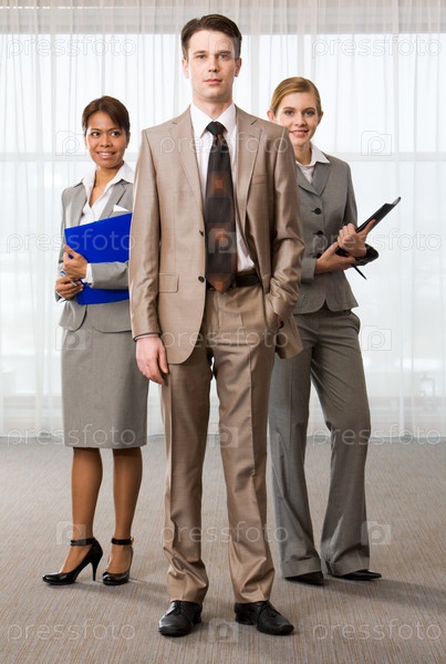 Три бизнес-партнера смотрят на камеру с успешным мужчиной перед собой
