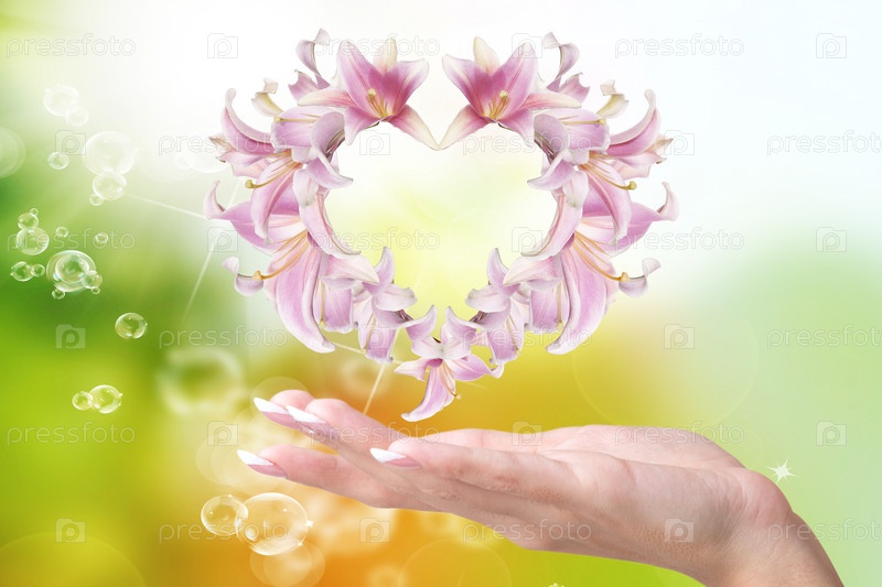 Женская рука и сердечко из бутонов розовой лилии