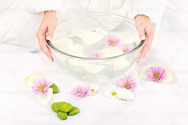 Руки женщины и миска с лепестками