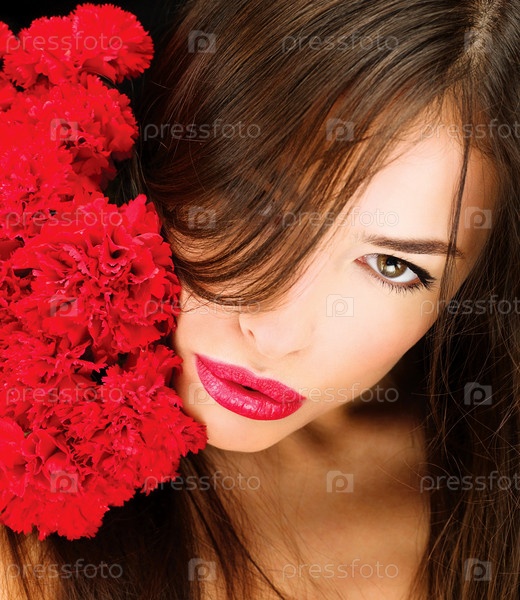 Женщина и букет красных гвоздик
