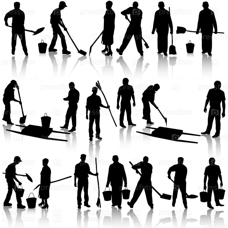 Набор силуэтов мужчин и женщин с лопатами и ведрами. Векторные иллюстрации