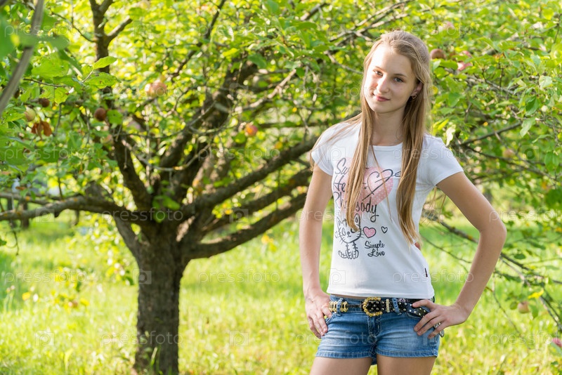 Девушка в яблоневом саду в летнее время