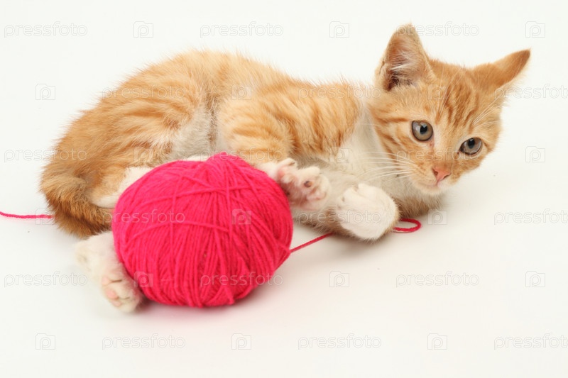 Рыжий котенок, играющий клубком