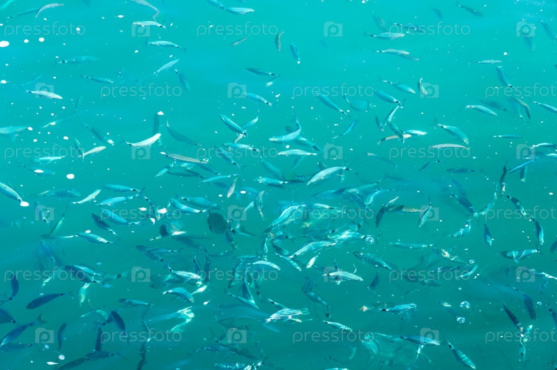Много мелких рыб у поверхности воды в море