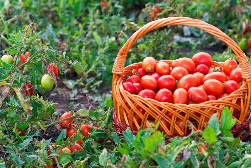 Помидоры в плетеной корзине на поле