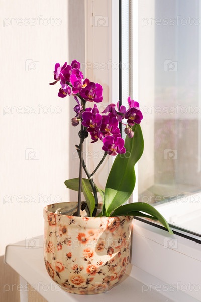 Розовая орхидея на подоконнике