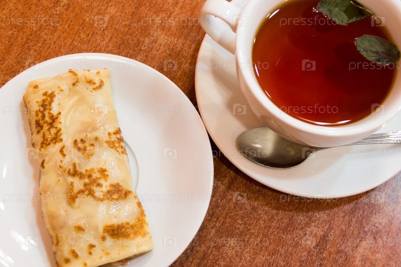 Блинчики с клубничным джемом и чай с мятой