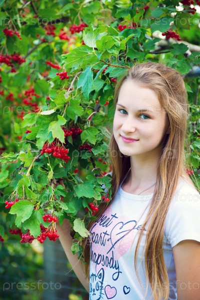 Девушка возле куста калины