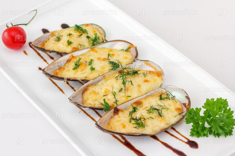 Запеченные мидии под сырным соусом