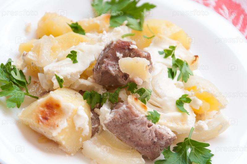 Печеный картофель с мясом в сливочном соусе