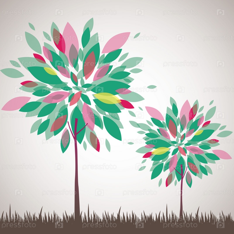 Два дерева с разноцветными листьями на коричневой траве
