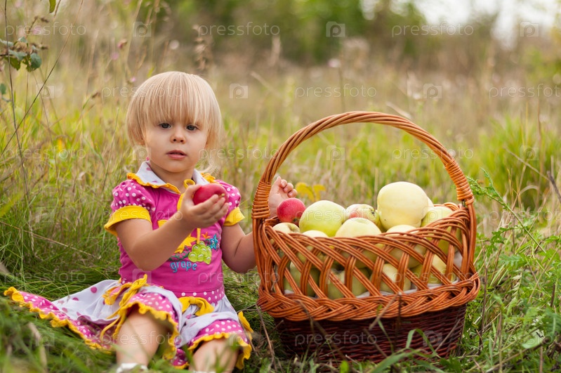 Девочка с корзиной свежих яблок