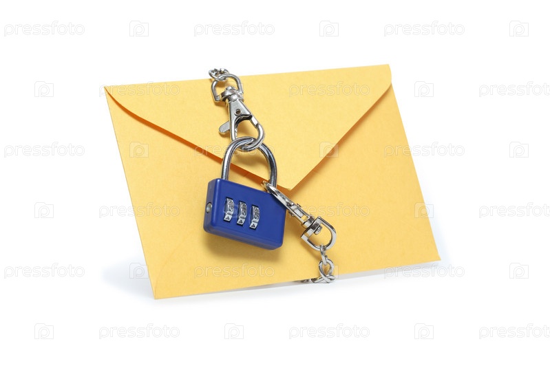 Желтый конверт с замком, изолированный на белом фоне