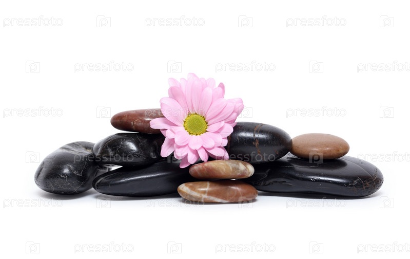 Гербера и морские камни на белом фоне