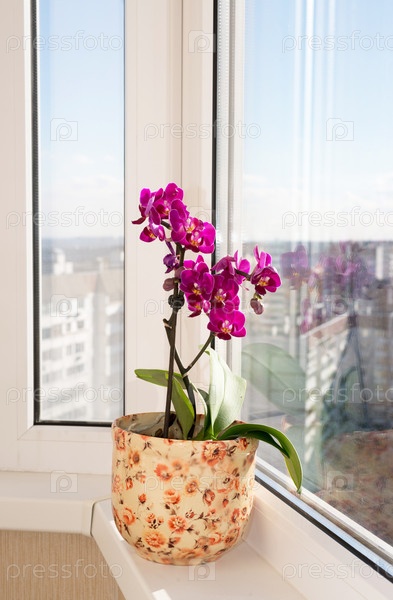 Розовая орхидея на подоконнике
