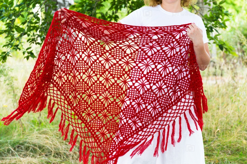 Женщина держит в руках вязаный платок