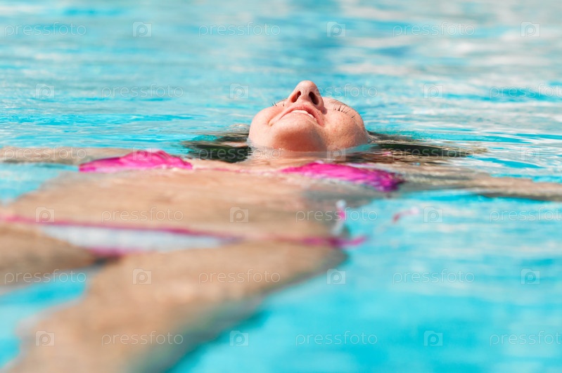 Счастливая девушка лежит на воде в бассейне