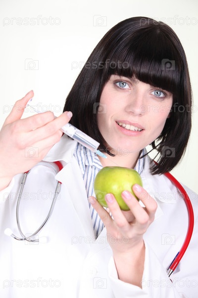 Доктор делает инъекцию в яблоко