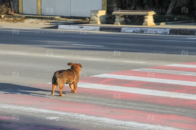 Собака переходит улицу по пешеходному переходу