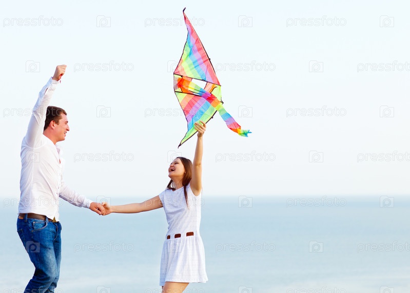 Счастливая пара запускает воздушного змея на пляже