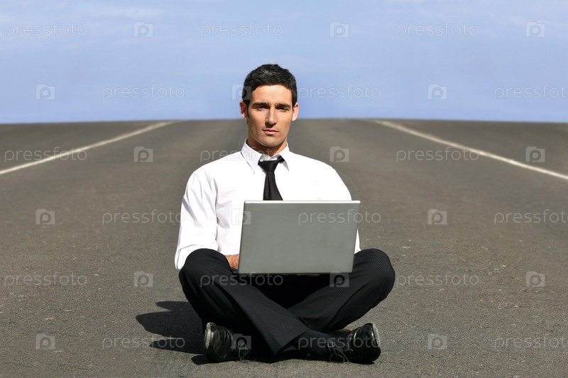 Мужчина с ноутбуком на взлетно-посадочной полосе