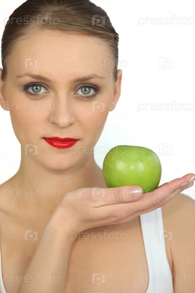 Женщина держит зеленое яблоко