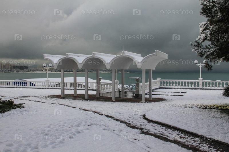 Зимний пейзаж с аркой в форме волны на входе пляжа «Звездочка»