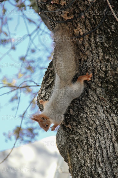 Белка бежит по стволу старого дуба