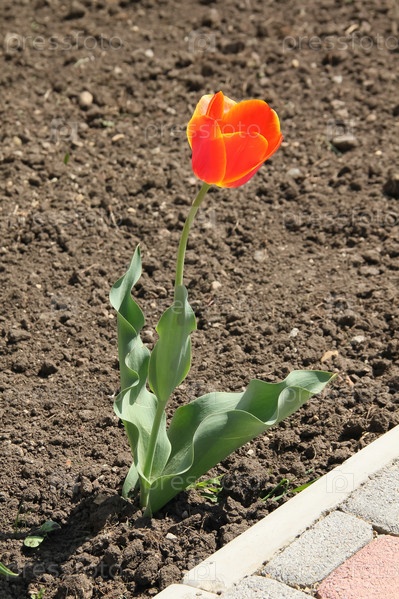 Красно-желтый тюльпан на грядке