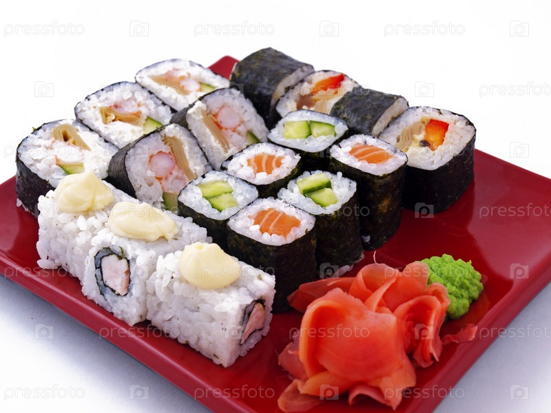 Аппетитные суши и роллы с имбирем и васаби на тарелке крупным планом