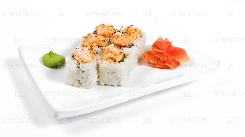 Аппетитные роллы с имбирем и васаби на тарелке на белом фоне