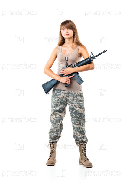 Молодая женщина в камуфляже с ружьем
