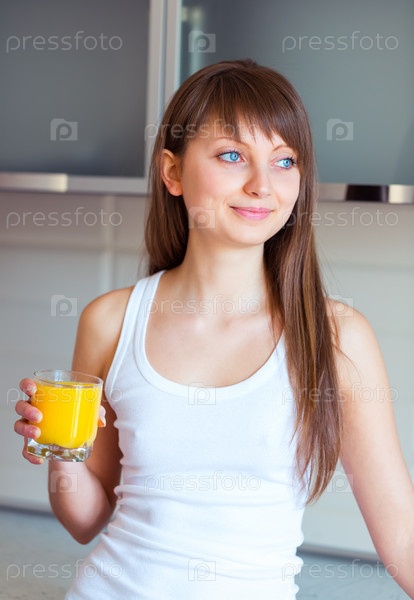 Девушка со стаканом сока на кухне
