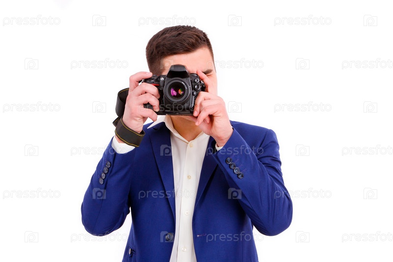 Фотограф с камерой, изолированный на белом фоне