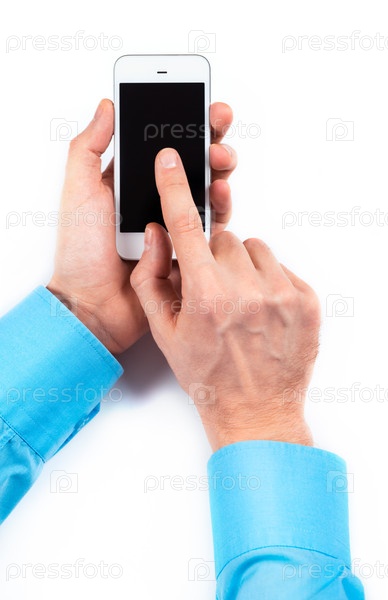 Смартфон в мужских руках на белом фоне