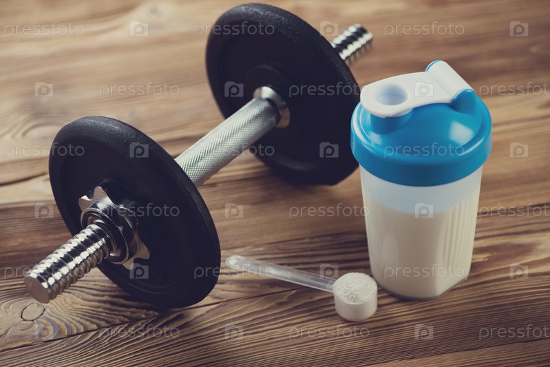 Протеиновый коктейль и гантель