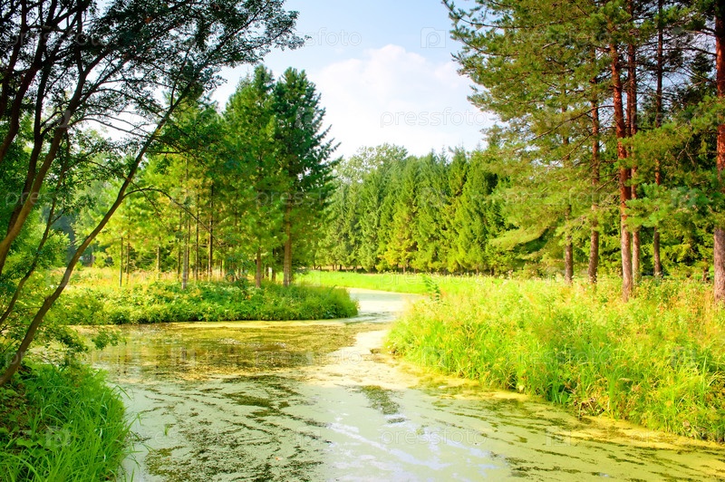 Грязная река в хвойном лесу