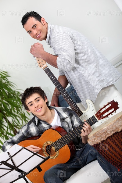Мужчина учит подростка играть на гитаре