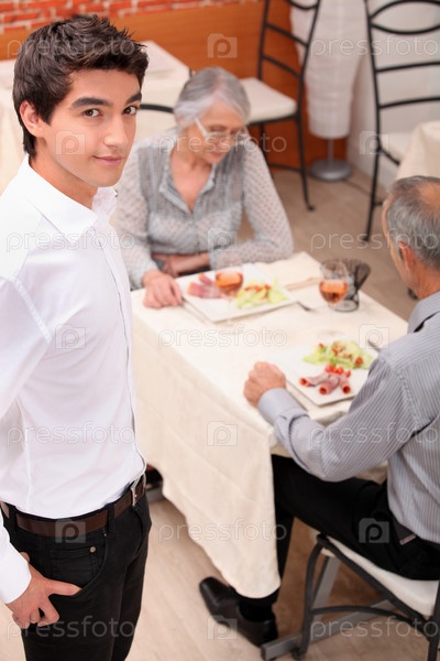 Пожилая пара и молодой официант в ресторане